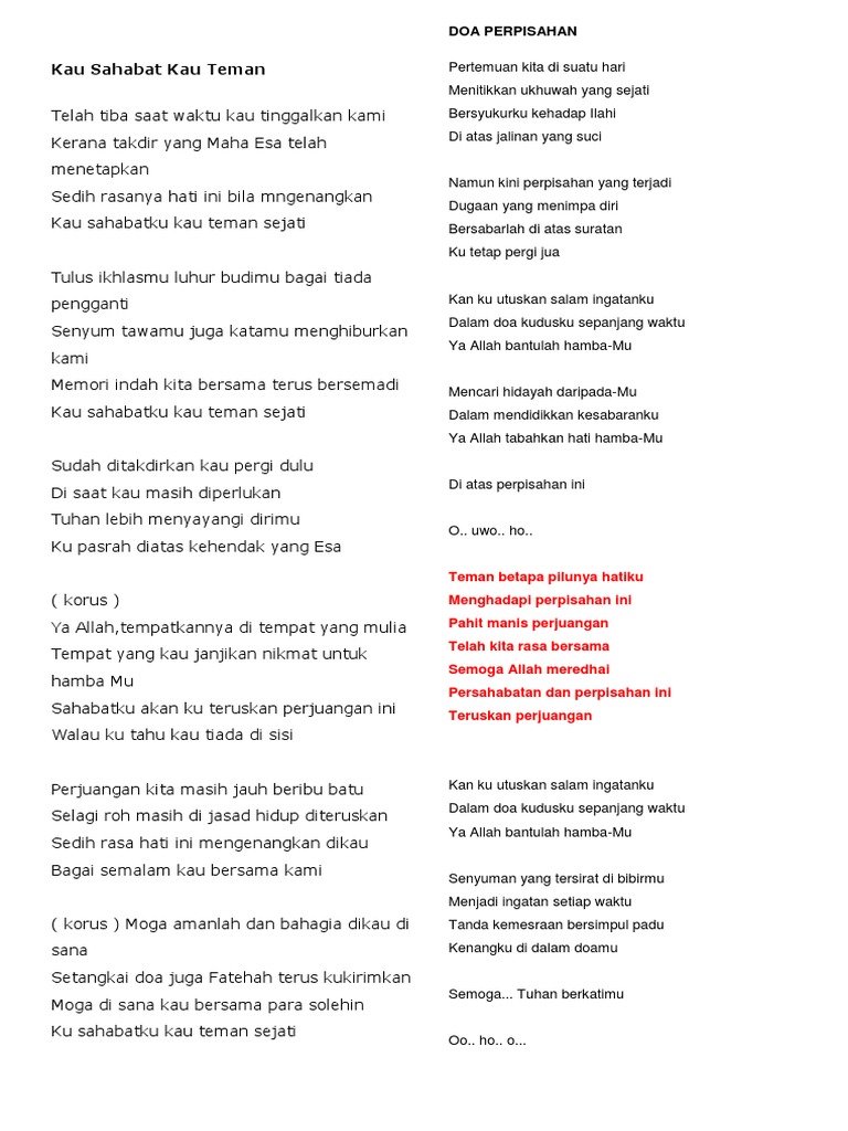 Sedih rasa hati ini mengenangkan dikau. Tulus ikhlasmu luhur budimu bagai tiada pengganti Senyum tawamu juga katamu menghiburkan kami Memori indah kita bersama terus bersemadi Kau sahabatku kau teman. Bertegur sapa penuh mesra Masa terus berlalu Dan kita tetap seiringan berjalan Menempuh onak liku Lalui semua suka dan duka bersama Biarlah apa pun.
